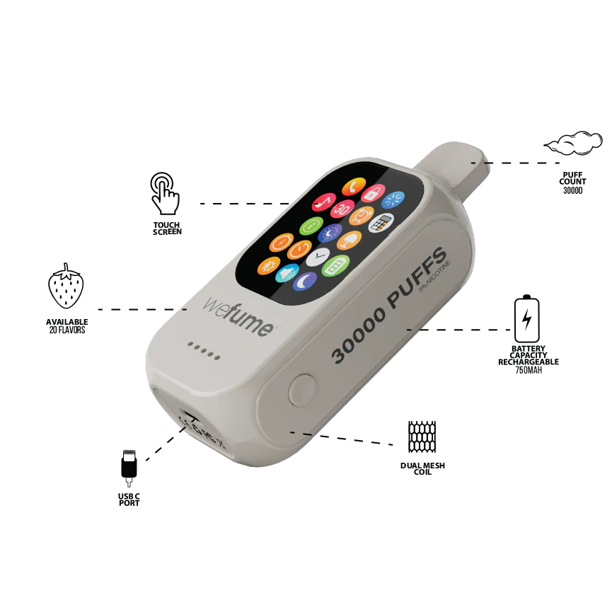 Introducing the WeFume 30,000 disposable vape pod by Fume, designed for a superior, long-lasting vaping experience. Delivering an impressive 30,000 puffs, this device features customizable settings for a personalized experience. It integrates seamlessly with smartphones through Bluetooth, allowing users to make calls, play music, and interact with voice assistants like Siri or Google. The WeFume 30000 also includes practical features such as a built-in clock and flashlight, enhancing convenience in everyday life. Discover the ultimate vaping experience with WeFume 30000 and explore our collection of disposable vape bundles for even more options.