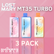The Lost Mary MT35000 Turbo is a high-capacity disposable vaping device featuring an upgraded dual-mesh coil system and dual vaping modes. The device offers up to 35,000 puffs in Smooth Mode or approximately 20,000 puffs in Turbo Mode.